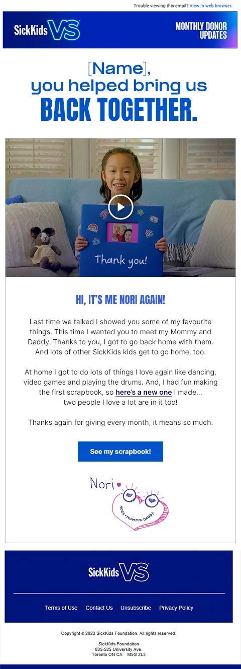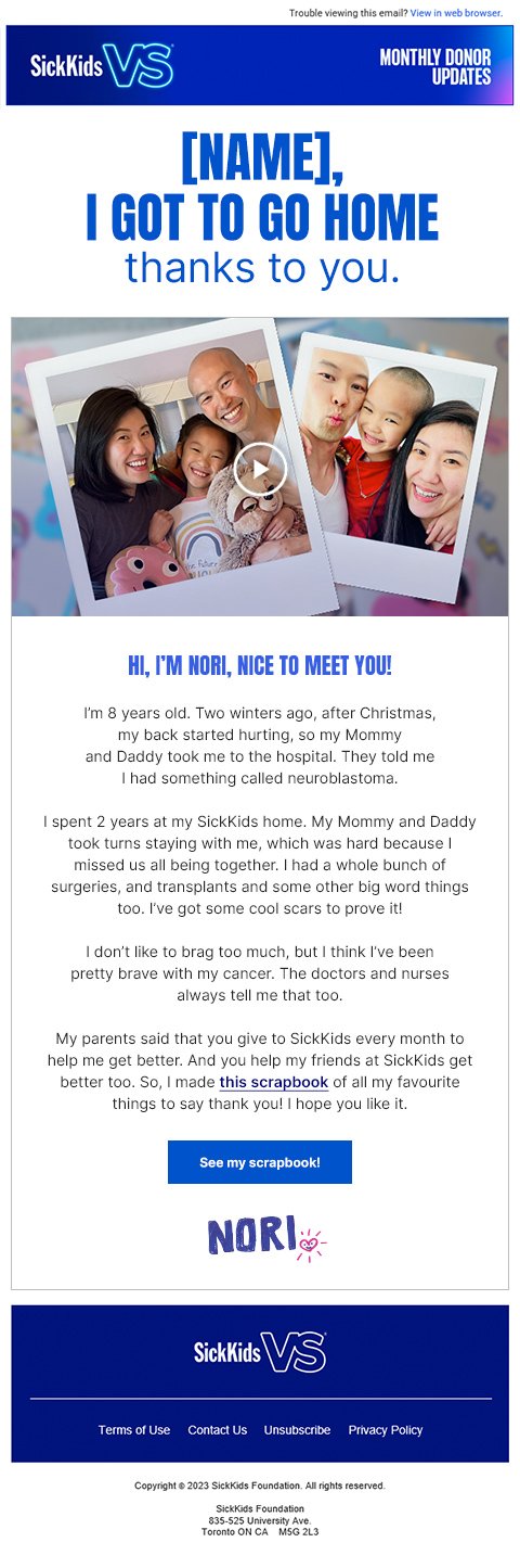 To show monthly donors who were at the risk of cancelling their donations the tangible impact of their generosity, we created a two-part video series featuring Nori, a brave young cancer patient at SickKids.